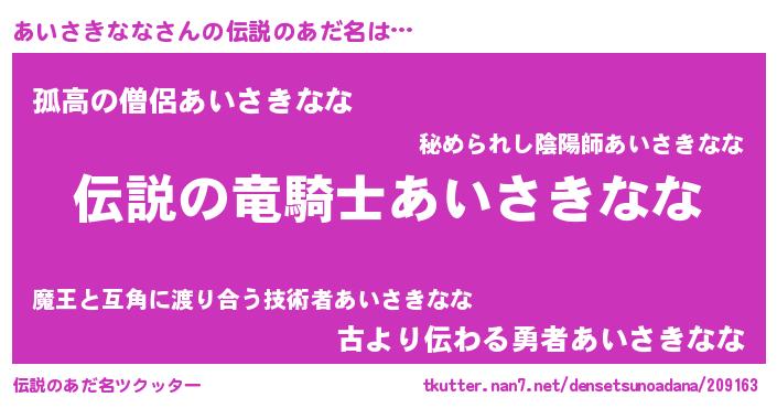 | 胡散臭い通販商品みたいなあだ名 | 『必ず成功するブレスレット…その名も「あいさきなな」』 |