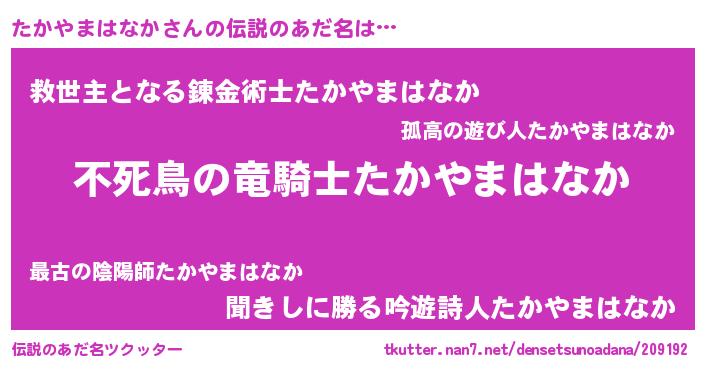 | 男性向けラノベタイトル風あだ名 | 『たかやまはなかに滅ぼされるだけの簡単なお仕事です』 |