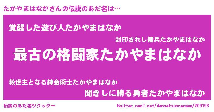 | 男性向けラノベタイトル風あだ名 | 『Re:たかやまはなかから始める異世界生活』 |