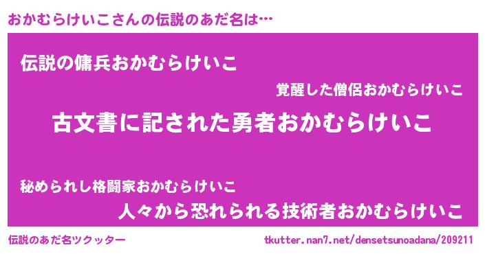 | 男性向けラノベタイトル風あだ名 | 『誰もが恐れるあのおかむらけいこが、ぼくの専属メイドになるようです。』 |