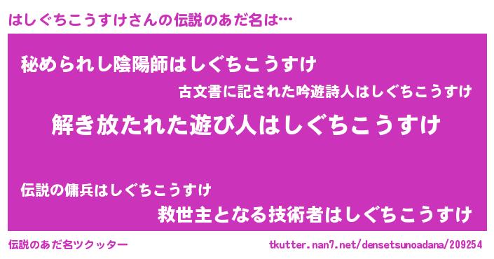 | 男性向けラノベタイトル風あだ名 | 『ダンジョンにはしぐちこうすけを求めるのは間違っているだろうか』 |