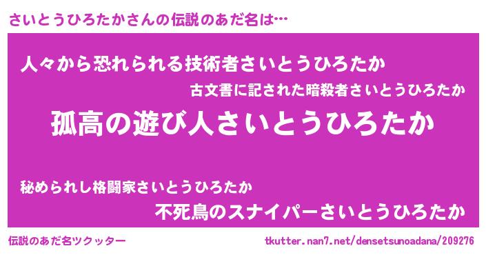 | 男性向けラノベタイトル風あだ名 | 『ダンジョンにさいとうひろたかを求めるのは間違っているだろうか』 |
