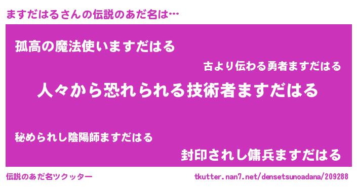 | 男性向けラノベタイトル風あだ名 | 『おまえをオタクにしてやるから、俺をますだはるにしてくれ! 』 |