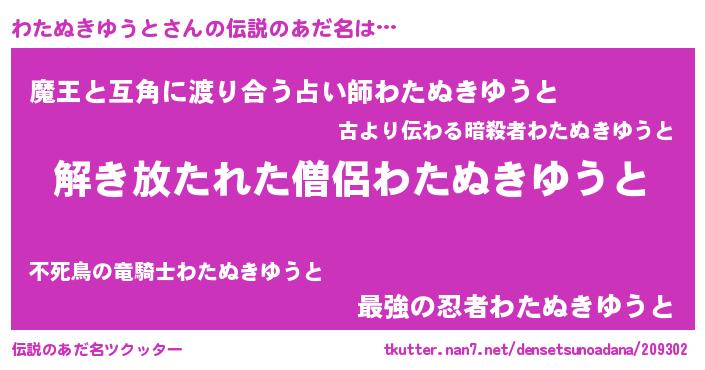 | 女子向けラノベタイトル風あだ名 | 『闇のわたぬきゆうと』 |