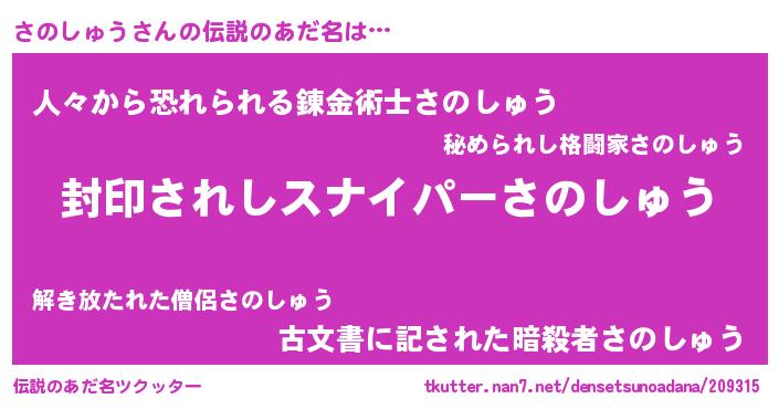 | 男性向けラノベタイトル風あだ名 | 『さのしゅう~年齢イコール彼女いない歴の魔法使い~』 |