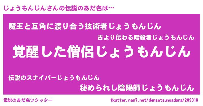 | 胡散臭い通販商品みたいなあだ名 | 『あなたにだけ特別に提供する限定10本のレアな日本酒…その名も「じょうもんじん」』 |