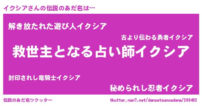 | ヒーロー風カッコイイあだ名 | 『天空の使者イクシア』『銀牙騎士イク』 |