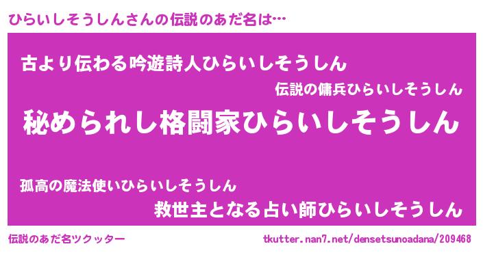 | 男性向けラノベタイトル風あだ名 | 『ヒライシソウシンスレイヤー』 |