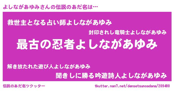 | 男性向けラノベタイトル風あだ名 | 『魔弾の王とよしながあゆみ』 |