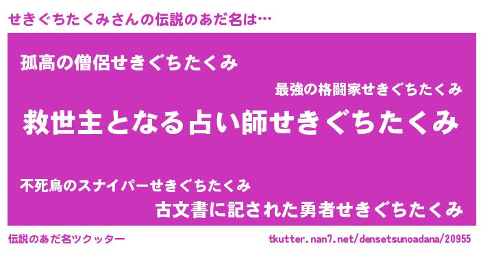 | 男性向けラノベタイトル風あだ名 | 『せきぐちたくみに滅ぼされるだけの簡単なお仕事です』 |