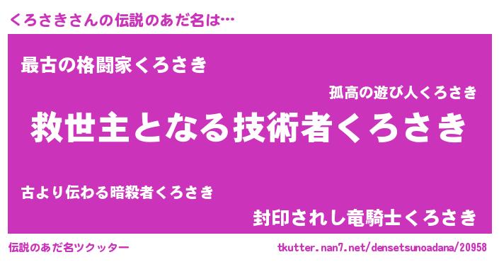 | 男性向けラノベタイトル風あだ名 | 『くろさき~年齢イコール彼女いない歴の魔法使い~』 |