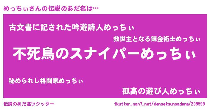 | 胡散臭い通販商品みたいなあだ名 | 『モテモテ間違いなし霊験あらたかなお札…その名も「めっちぃ」』 |