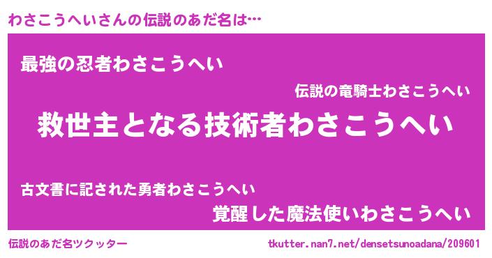 | 男性向けラノベタイトル風あだ名 | 『この素晴らしい世界にわさこうへいを!』 |