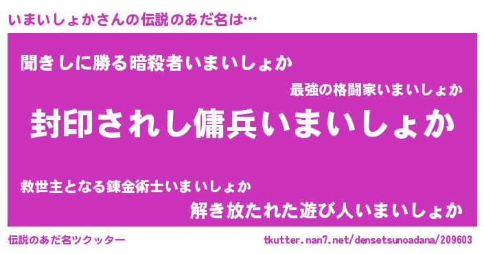 | 男性向けラノベタイトル風あだ名 | 『いまいしょか~年齢イコール彼女いない歴の魔法使い~』 |