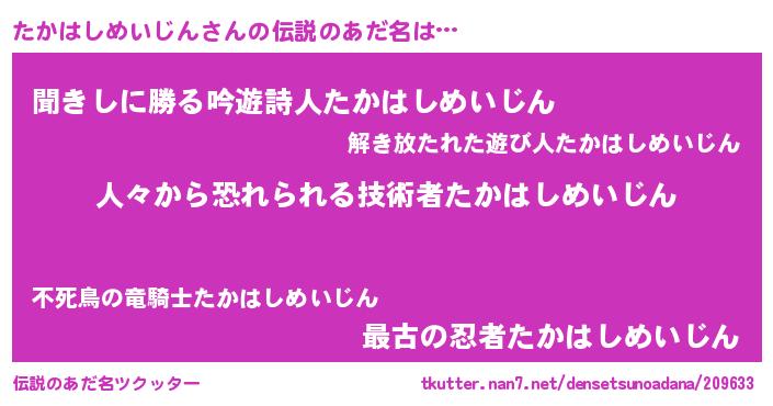 | ヘコむあだ名 | 『たかはしめいじん(笑)』『なまこ酢』 |