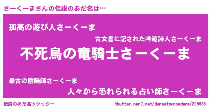 | 女子向けラノベタイトル風あだ名 | 『さーくーま姫と円卓の騎士』 |