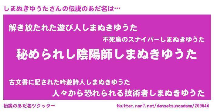 | 男性向けラノベタイトル風あだ名 | 『シマヌキユウタスレイヤー』 |