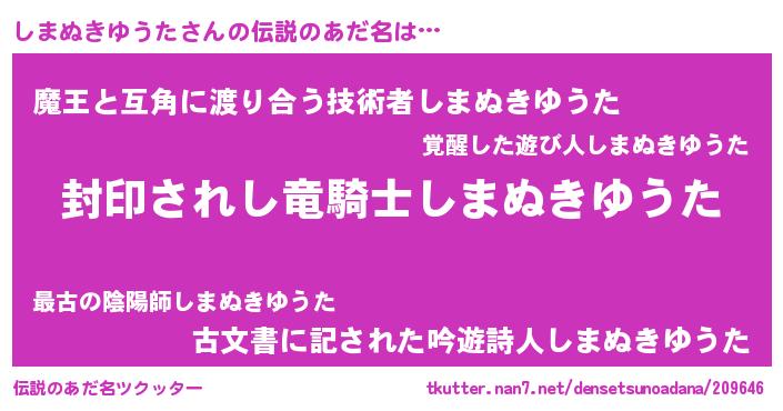 | 男性向けラノベタイトル風あだ名 | 『シマヌキユウタアートオンライン』 |