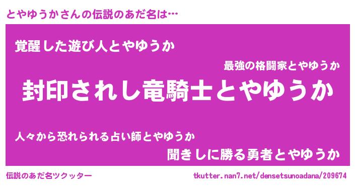 | ヒーロー風カッコイイあだ名 | 『仮面トヤダー』『最強戦士トヤユウカ』 |