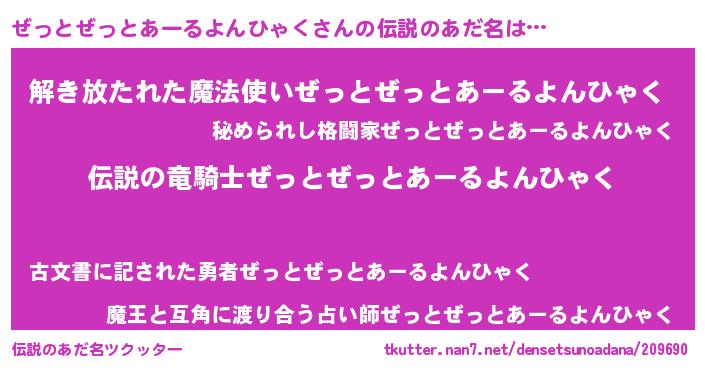 | 意味不明あだ名 | 『自称ぜっとぜっとあーるよんひゃく』 |