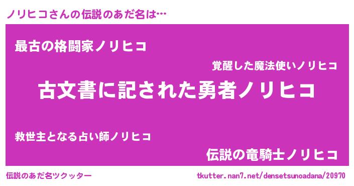 | 女子向けラノベタイトル風あだ名 | 『ノリヒコの玉の輿計画!』 |