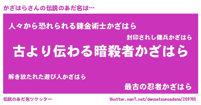 | 胡散臭い通販商品みたいなあだ名 | 『来世でも幸せになれる健康食品…その名も「かざはら」』 |
