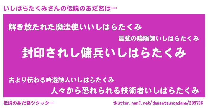 | 男性向けラノベタイトル風あだ名 | 『イシハラタクミアートオンライン』 |