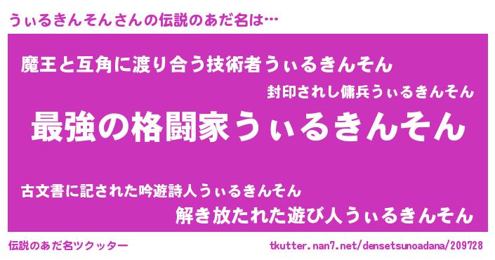 | 意味不明あだ名 | 『住所不定無職うぃるきんそん(1歳)』 |