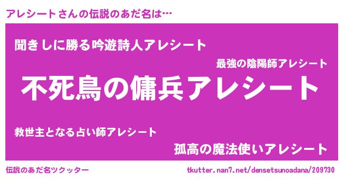 | 男性向けラノベタイトル風あだ名 | 『アレシートの憂鬱』『緋弾のアレシート』 |