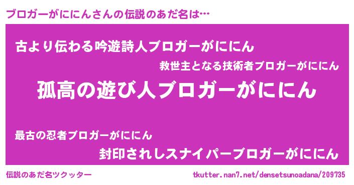 | ヒーロー風カッコイイあだ名 | 『暗黒騎士ブロ』『ネオブロガーガニニン』 |
