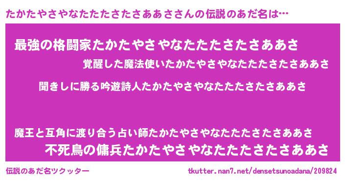 | 男性向けラノベタイトル風あだ名 | 『たかたやさやなたたたさたさああさという概念が存在しない退屈な世界 』 |