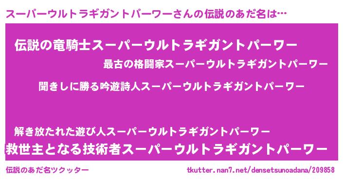 | 男性向けラノベタイトル風あだ名 | 『スーパーウルトラギガントパーワーという概念が存在しない退屈な世界 』 |