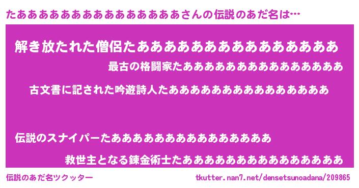 | 男性向けラノベタイトル風あだ名 | 『この素晴らしい世界にたあああああああああああああああを!』 |