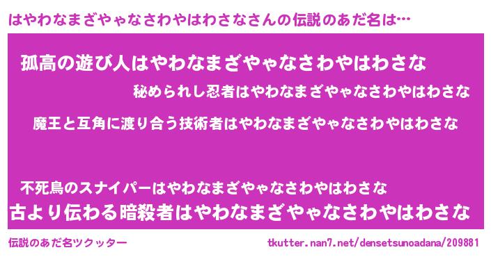 | 意味不明あだ名 | 『住所不定無職はやわなまざやゃなさわやはわさな(9歳)』 |
