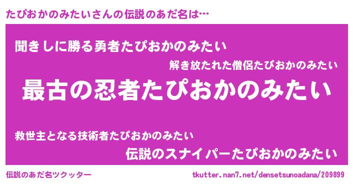 | 男性向けラノベタイトル風あだ名 | 『うちの娘の為ならば、俺はもしかしたらたぴおかのみたいも倒せるかもしれない。』 |