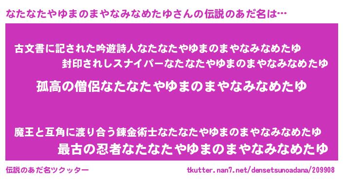 | 女子向けラノベタイトル風あだ名 | 『なたなたやゆまのまやなみなめたゆは平凡を望む』 |