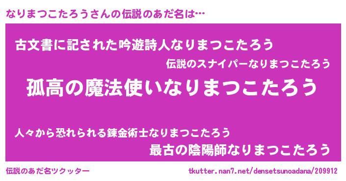 | ヒーロー風カッコイイあだ名 | 『暗黒騎士ナリ』『ネオナリマツコタロウ』 |