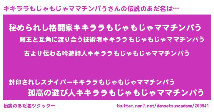 | ヒーロー風カッコイイあだ名 | 『サイバー戦士キキララモジャモジャママチンパウ』 |
