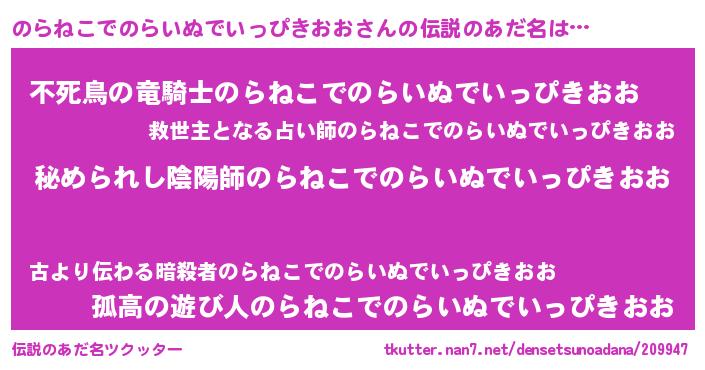| ファンタジー風あだ名 | 『エターナルノラネコデノライヌデイッピキオオー』 |