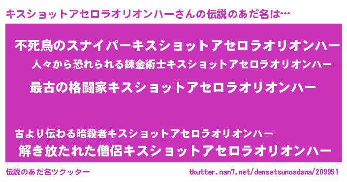 | 意味不明あだ名 | 『住所不定無職キスショットアセロラオリオンハー(6歳)』 |