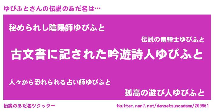 | 男性向けラノベタイトル風あだ名 | 『Re:ゆびふとから始める異世界生活』 |