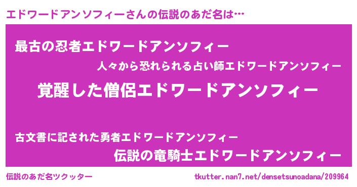 | 意味不明あだ名 | 『住所不定無職エドワードアンソフィー(50歳)』 |