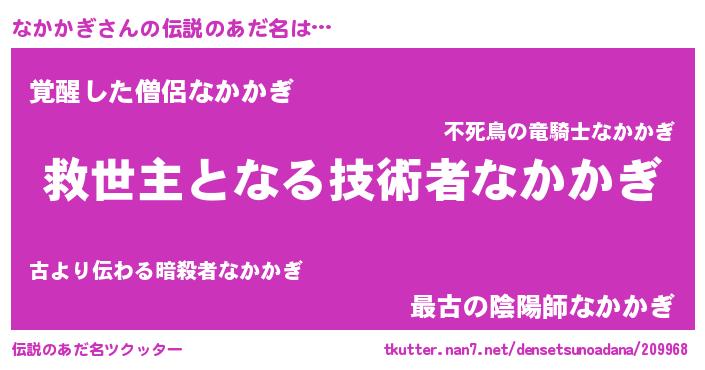 | ヒーロー風カッコイイあだ名 | 『慈愛の使者なかかぎ』『炎刃騎士ナカ』 |