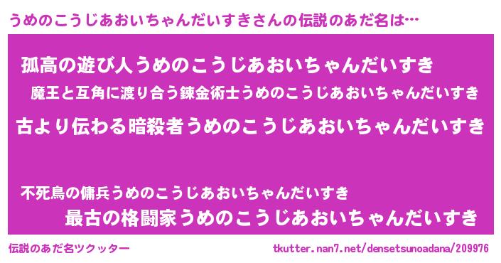 | ヒーロー風カッコイイあだ名 | 『ネオウメノコウジアオイチャンダイスキ』 |