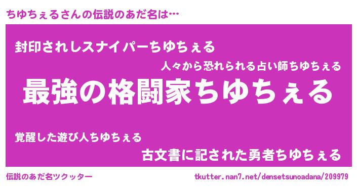 | 男性向けラノベタイトル風あだ名 | 『ちゆちぇる~年齢イコール彼女いない歴の魔法使い~』 |