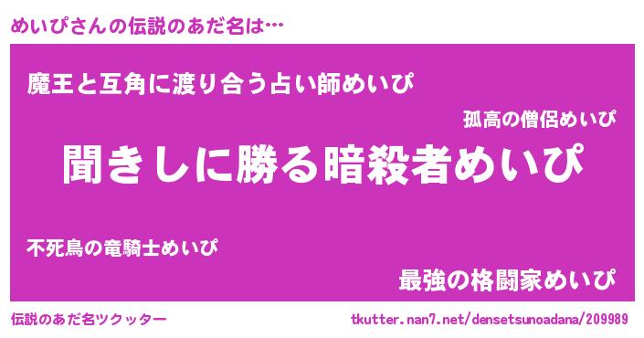 | 男性向けラノベタイトル風あだ名 | 『めいぴという概念が存在しない退屈な世界 』 |