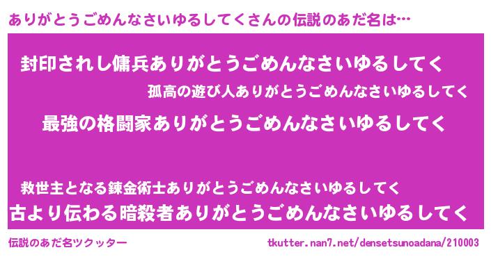 | 男性向けラノベタイトル風あだ名 | 『ありがとうごめんなさいゆるしてくに滅ぼされるだけの簡単なお仕事です』 |