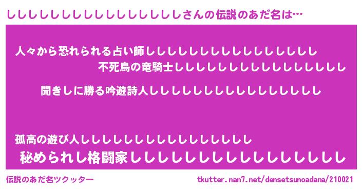 | 男性向けラノベタイトル風あだ名 | 『魔弾の王としししししししししししししししし』 |