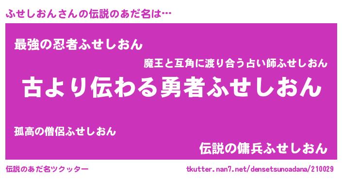 | 男性向けラノベタイトル風あだ名 | 『ふせしおんに滅ぼされるだけの簡単なお仕事です』 |
