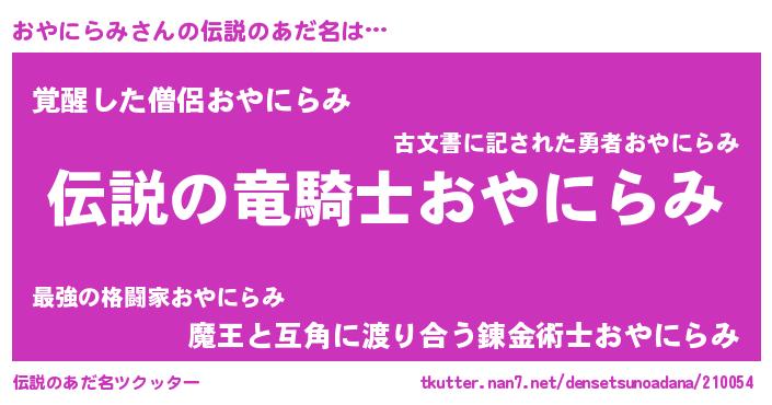 | 意味不明あだ名 | 『自称おやにらみ』『ペロリンおやにらみ』 |